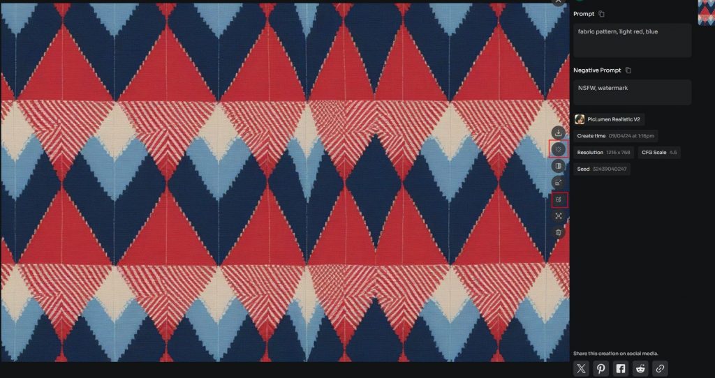 Choose the dimensions of your fabric pattern design. PicLumen supports a variety of picture sizes, allowing you to customize your design to meet your individual requirements, whether it’s a little accessory or a large cloth panel.