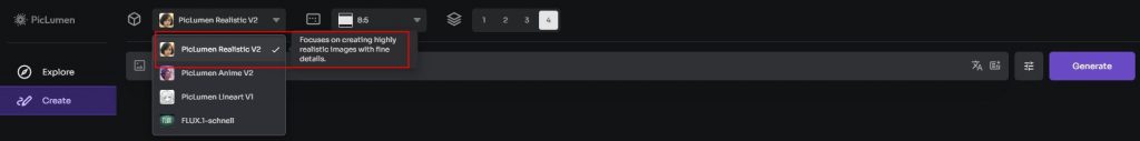 PicLumen provides four models for users. Based on experience, we recommend a realistic V2 model that better matches the AI pattern art topic.