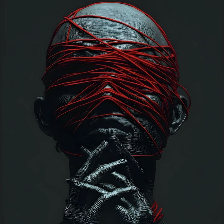 A blurry profile of a person looking up with dramatic red and teal light motion streaks.