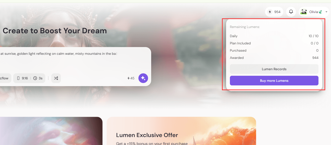 在右上角可以看到你的 Lumens 餘額。 將滑鼠移到圖示上即可查看詳細資訊,包括: ● 每日獎勵(10 Lumens) ● 方案內含 ● 已購買 ● 已獲得 你也可以: 點擊「Lumen 紀錄」查看使用歷史 點擊「購買更多 Lumens」在餘額不足時加值